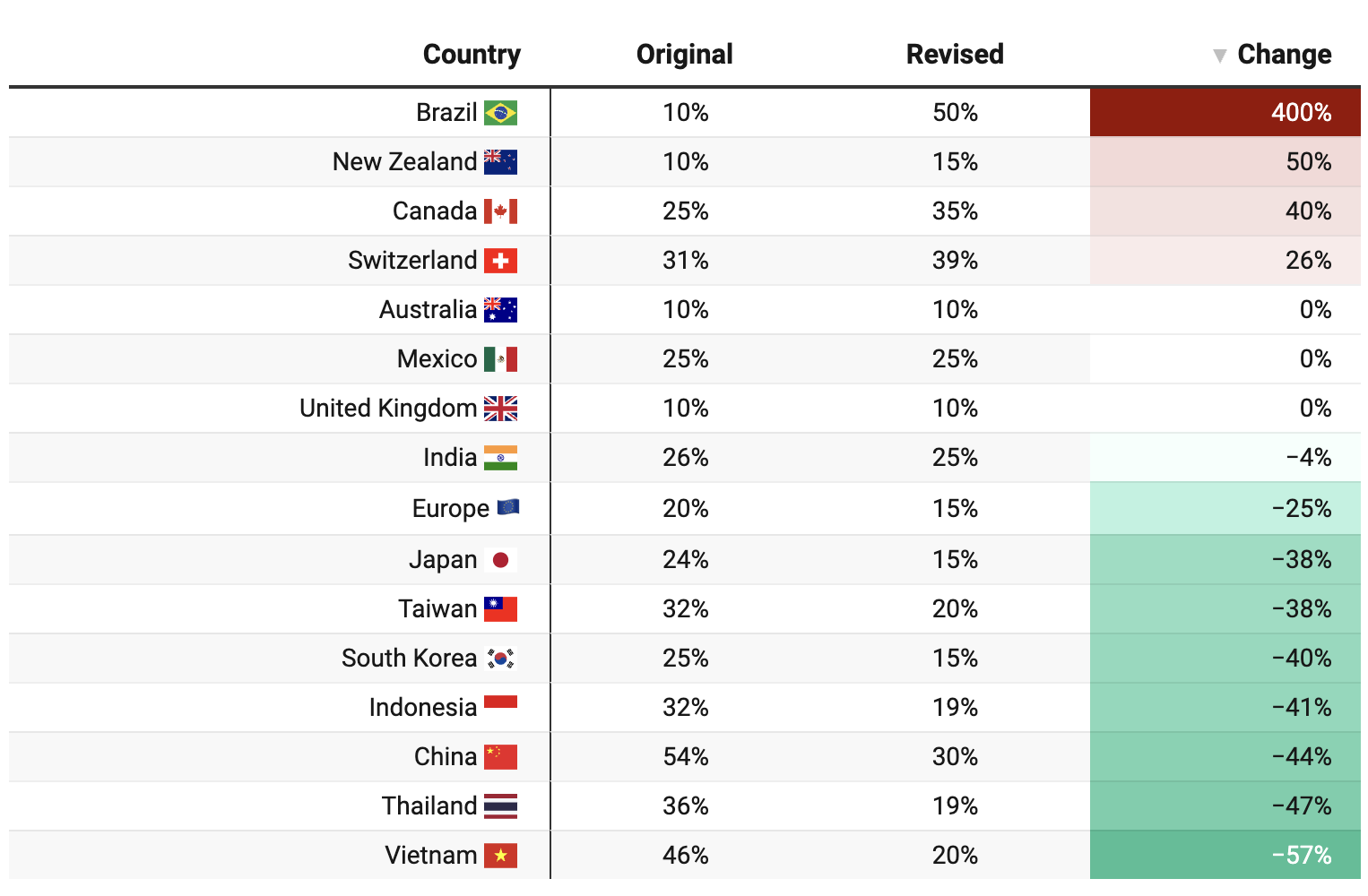 For most countries, the revised tariffs are lower than the original ones. But Brazil, Switzerland and New Zealand are subject to higher tariffs than those announced in April.