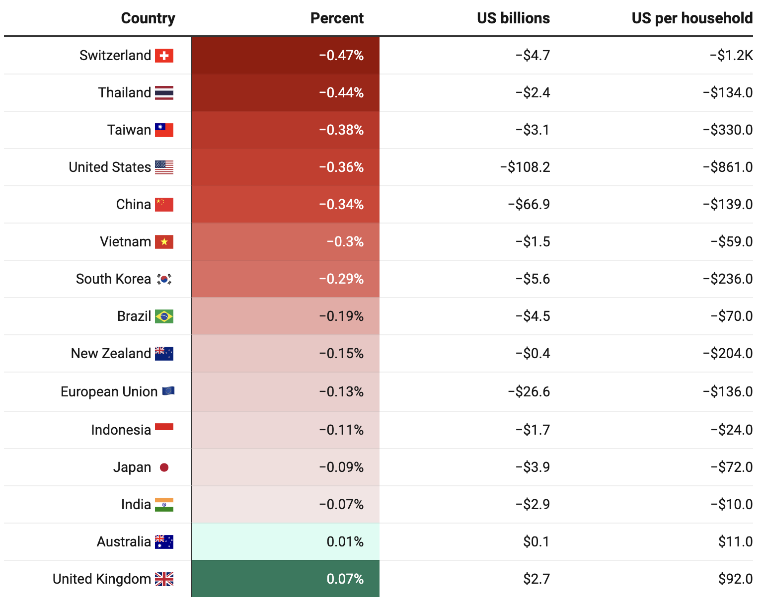 For most other countries, the additional tariffs reduce GDP. Switzerland’s GDP decreases by 0.47%, equivalent to $1,215 per household per year. Proportional GDP decreases are also relatively large for Thailand (0.44%) and Taiwan (0.38%).